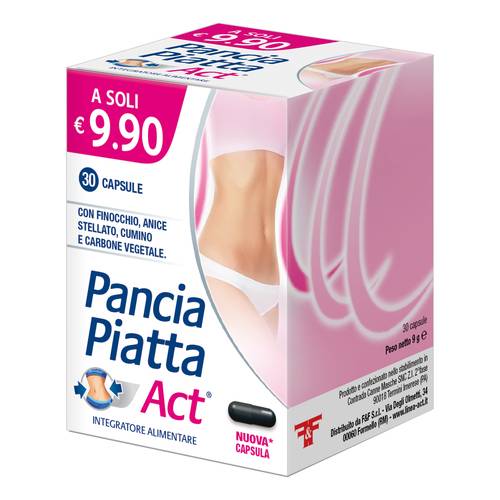 PANCIA PIATTA ACTDescrizione Integratore alimentare con finocchio, anice stellato, cumino che hanno funzione digestiva e favoriscono la regolare motilità gastrointestinale ed eliminazione dei gas. Ingredienti Carbone vegetale (Carbo vegetabilis ex ligno), gelatina alimentare, anice stellato frutti Carbone vegetale (Carbo vegetabilis ex ligno) polvere, cumino frutti polvere (Cuminum Cyminum L.), finocchio frutti polvere (Foeniculum vulgare Mill.), anice stellato frutti polvere (Illicium Verum Hook.f.); antiagglomerante: magnesio stearato vegetale. Caratteristiche nutrizionali Analisi media per 2 capsule Carbone vegetale 489 mg Cum...